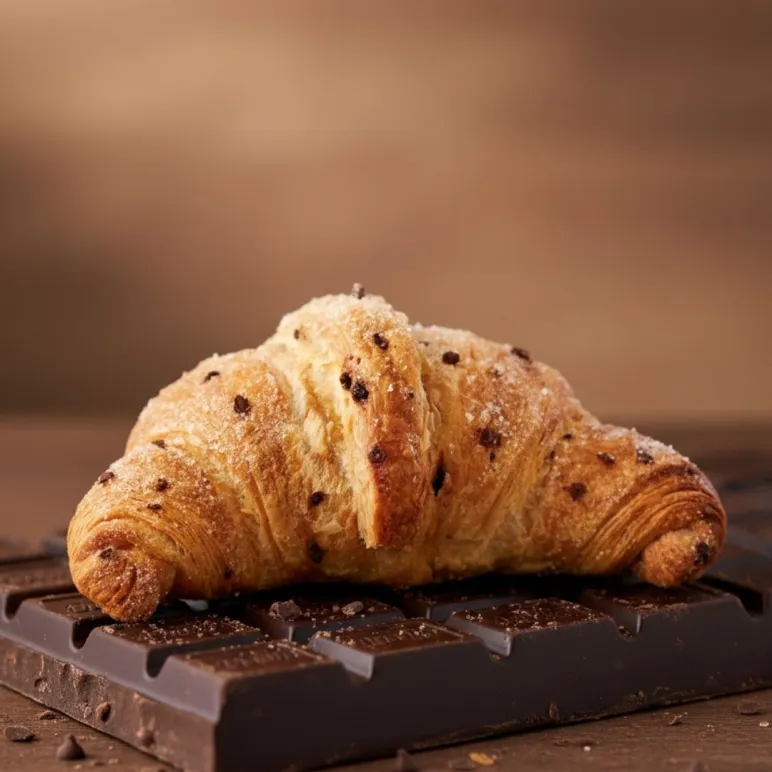 Croissant in limited edition dalla pasta morbida e sfogliata, al profumo di fiordilatte, con gocce di cioccolato nell’impasto e farcitura al fiordilatte, decorato con zucchero.