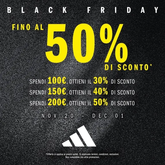 Black Friday Adidas: spendi 100€ e ottieni il 30% di sconto, spendi 150€ e ottieni il 40% di sconto, spendi 200€ e ottieni il 50% di sconto